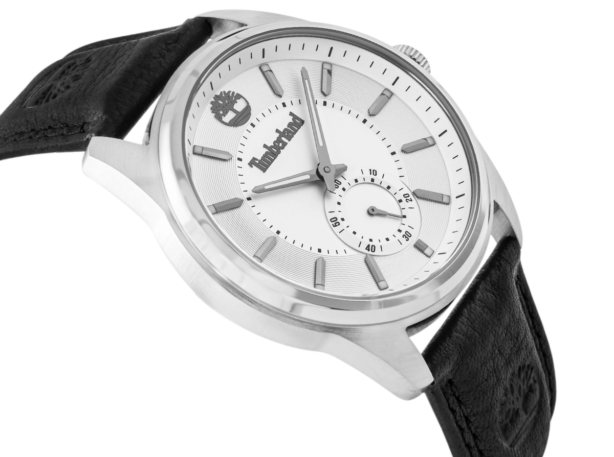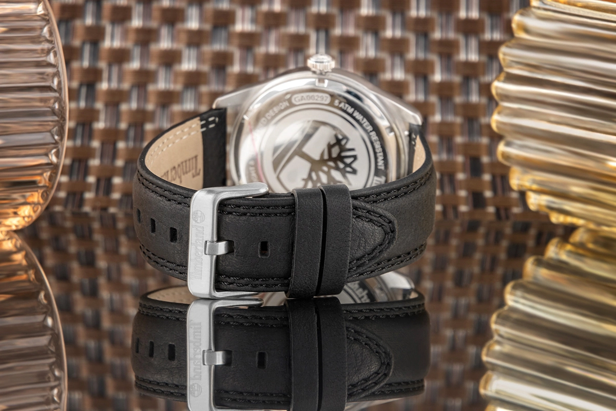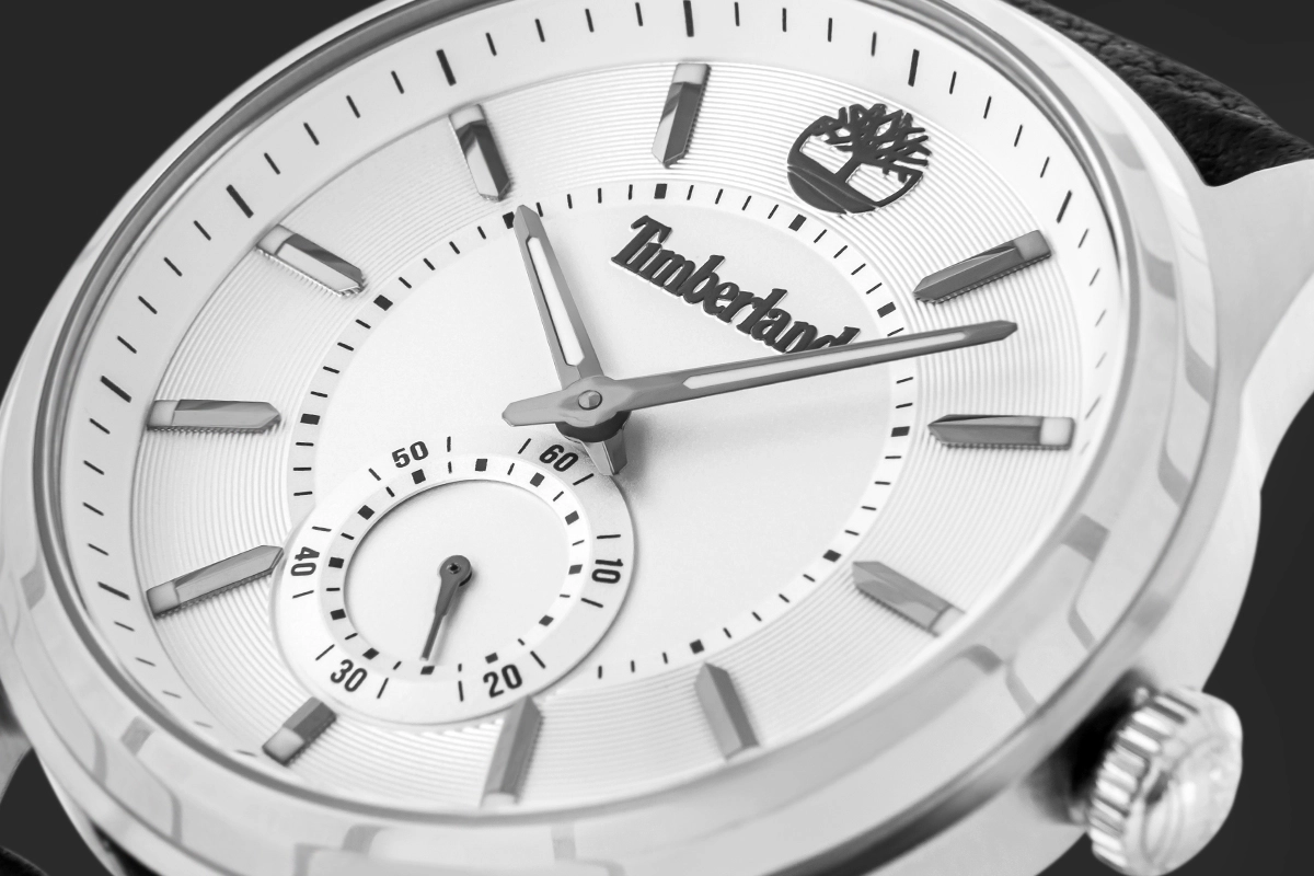 Centralne, subtelnie zagłębione koło otacza dekoracyjny szlif słoneczny, który pięknie łapie światło pod każdym kątem. Wypukłe, polerowane indeksy osadzone na wyższym pierścieniu dodają tarczy przestrzenności i elegancji. Na godzinie 12 dumnie prezentuje się trójwymiarowe logo drzewa Timberland, będące nie tylko detalem, ale wyrazem DNA marki. Całość łączy surową precyzję z nowoczesną estetyką – to tarcza, która żyje i zmienia się w zależności od światła i ruchu.